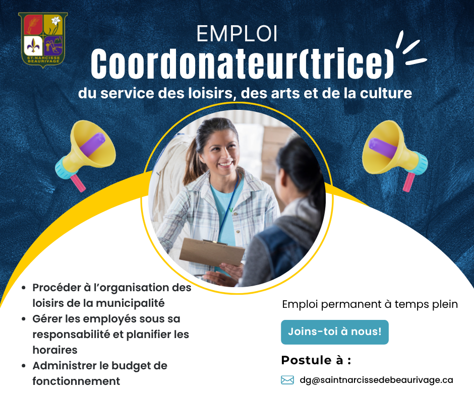 BienvenueEmploi disponible Coordonateur(trice) du service des loisirs, des arts et de la culture Sous la responsabilité de la directrice générale et greffière-trésorière, la ou le titulaire du poste exécute toutes les tâches reliées aux loisirs, aux arts et à la culture, ainsi qu’aux affaires communautaires de la municipalité. Voir les détails de l'offre d'emploi Postulez avant le 17 octobre 2025, 11 h 30 à : [email protected] Nouvelle salle du conseil Veuillez noter que la nouvelle salle du conseil est désormais située au rez-de-chaussée de l'hôtel de ville, au 400, rue Principale, à Saint-Narcisse-de-Beaurivage.