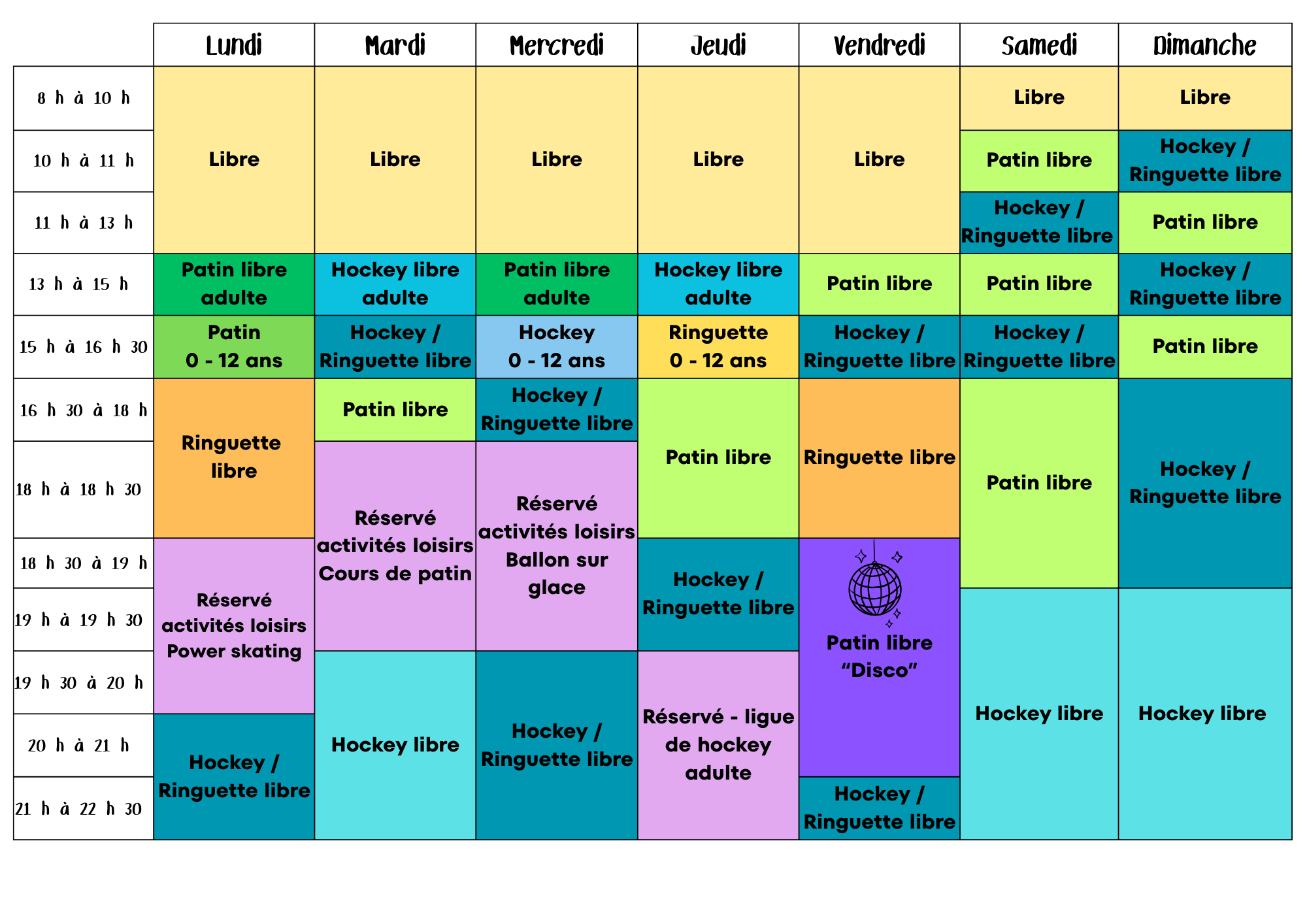 PATINAGE LIBRE NB Le port de mitaine ou de gants est obligatoire et le port du casque est recommandé. ** Nous vous demandons de respecter la plage horaire de patinage libre donc pas de hockey ni de ringuette. ** ** Nous ne sommes pas responsables des objets perdus ou volés. ** Merci de votre collaboration Non-Résident : Hockey 12 ans et moins 2 $, 13 ans et plus 4 $ Patinage libre 2 $ Pour de plus amples informations 418 475-2646 ou au 418 475-6842 poste 102. Jeux d'eau & piscine extérieure